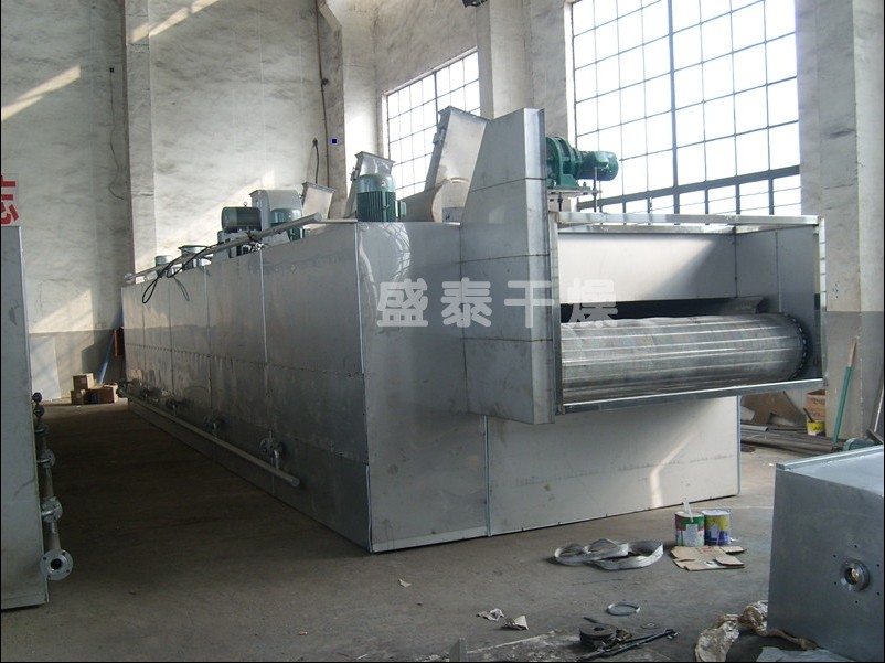 将需要处理的物料通过适当的布料机构,如星型布料机、摆动带、粉碎机或造粒机,分布在输送带上,输送带通过一个或几个加热单元组成的通道,每个加热单元均配有空气加热和循环系统,每一个通道有一个或几个排湿系统,在输送带通过时,热空气从上往下或从下往上通过输送带上的物料,从而使物料能均匀干燥。